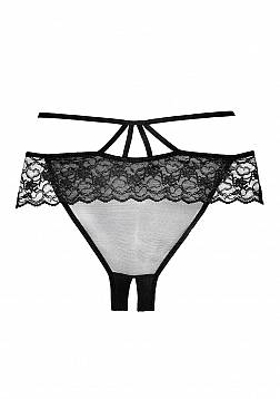 Crotchless sheer panty with a rhapsody of floating scalloped lace topped with dainty bands.