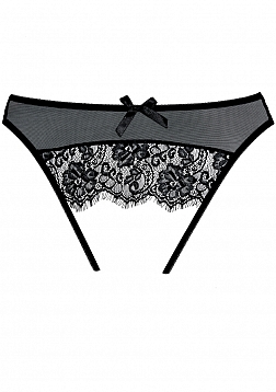 Hidden desires revealed in this seemingly secretive sheer mesh crotchless panty, with eyelash lace caressing the ouverte derriere. That it is topped with a bow is a wink of sweet, sprinkled over a flow of naughty.