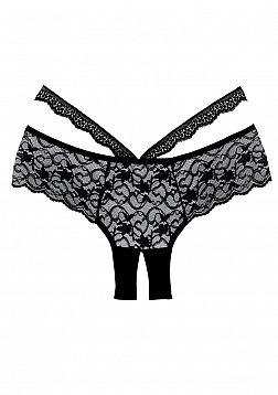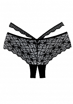 A whirlwind of scalloped lace covers your hips and derriere in this sumptuous open gusset boy cut panty, with high lace straps that sweep up on an angle to create an hourglass effect