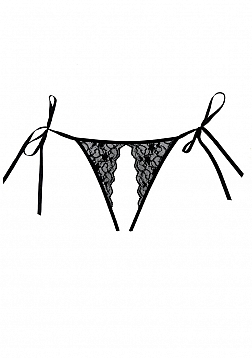 Teasing skinny ribbons decorate the hips, waiting to be undone. Scalloped lace outlines a provocative ouverte front, while the Brazilian back is topped with a triangle of sheer mesh.