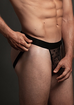 A sheer jock with an all-star motif. Elastic waistband, elasticized pouch, elastic thigh straps and open back.
