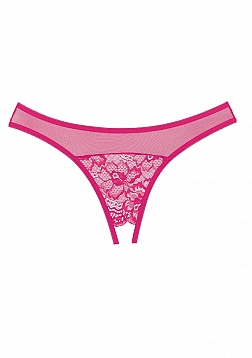 Fantasy follows where rumors go in this sinfully erotic crotchless panty, with a sneaky ouverte back. Delicate lace kisses both the front and back, and is topped all around by a band of sheer mesh.