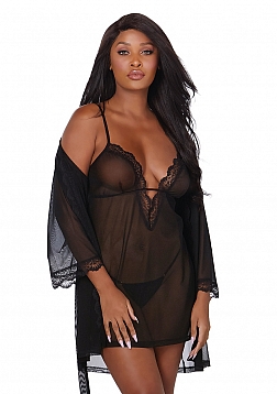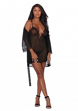 Stretch mesh chemise and robe set. Scalloped lace trim throughout. Adjustable straps. U-back with back hook closure.