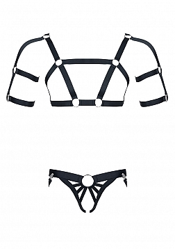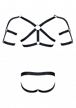 Bondage rubber t-shirt and men's rubber briefs with decorative element in the front and flexible clasp.