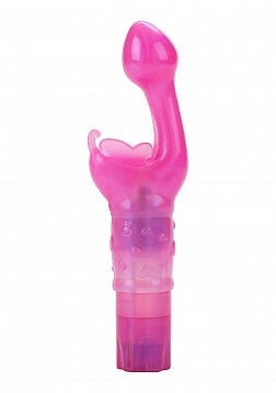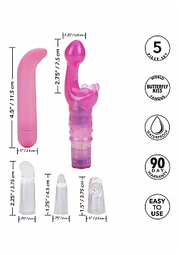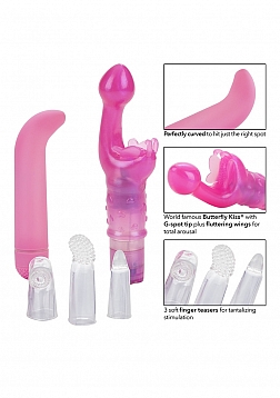 This kit is the ultimate starter collection for intimate erotic play. The kit includes everything you need to arouse, stimulate and delight the super sensitive G-spot. The hot pink arouser is made from soft and smooth body safe TPR and features a flexible bud shaped G-spot tip and flickering butterfly antennae, for added clitoral stimulation. The multi-speed compact massager has a curved angled tip for precision arousal application.