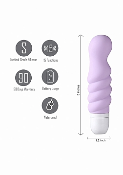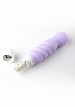Maia Toys Chloe Silicone G-Spot Lavender Vibrator. Silicone twisty, curved, non-phallic shaft. Swirled pattern throughout with 15 vibrating pulsations. Waterproof vibrations. Vibrator requires 1 AA battery, not included.
