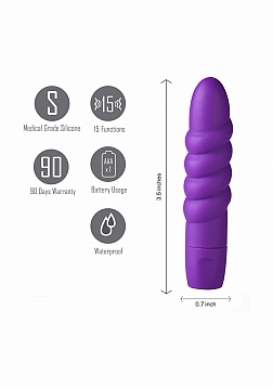 Maia Toys Sugr Mini Bullet Vibrator Purple. Silicone twisty, curved, non-phallic shaft. Swirled pattern throughout with 15 vibrating pulsations. Waterproof vibrations. Vibrator requires 1 AAA battery, not included.