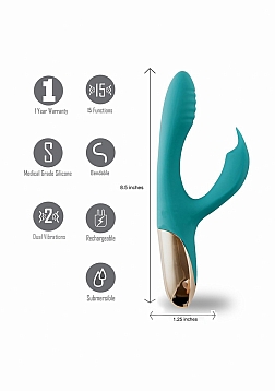 | Dimensions package | 14,50 x 6,70 x 26,50 cm | | Weight package | 484 gram | | Product dimensions | 14,5 x 6,7 x 26,5 cm | | Product weight | 219 gram | | Product diameter | 3,2 cm | | Insertable length | 12,2 cm | | Quantity motors | 2 | | Rotations per minute | 10000 RPM | | Rotations vibration tip | 7000 RPM | | Speed modes | 15 | | Noise level | 48 dB | | Rechargeable | Yes | | Rechargeable time | 30 min | | Recharged battery lifetime | 180 min | | Waterproof | Yes | | Phthalate free | Yes | | Materials | Silicone, ABS |
