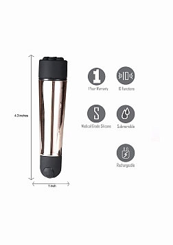| Dimensions package | 9,20 x 4,40 x 19,50 cm | | Weight package | 222 gram | | Product dimensions | 9,2 x 4,4 x 19,5 cm | | Product weight | 50 gram | | Product diameter | 2,5 cm | | Quantity motors | 1 | | Rotations per minute | 8800 RPM | | Speed modes | 10 | | Noise level | 48 dB | | Rechargeable | Yes | | Rechargeable time | 30 min | | Recharged battery lifetime | 180 min | | Waterproof | Yes | | Phthalate free | Yes | | Materials | Silicone, ABS |