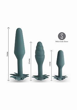 Doobie 420 Butt Plugs Set Of 3 from Maia Toys. 100% medical grade Silicone. Waterproof and submersible non-vibrating. Contoured for safe insertion and easy removal. Rimmed to prevent over insertion. Followed by pot leaves. Classic style large butt plug 5 inches, medium butt plug and small butt plug 3 inches. Always use water based personal lubricant with these butt plugs. Never silicone based. Doobies Pot Leaf Anal Trainer Kit start small, move to medium is a bubble style graduated shaft finish with large butt plug. Made using body safe, phthalate free Silicone.