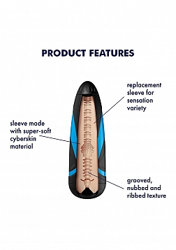| Dimensions package | 8,30 x 6,80 x 20 cm | | Weight package | 390 gram | | Product dimensions | 7,9 x 6,6 x 21,8 cm | | Product weight | 302 gram | | Waterproof | Yes | | Splashproof | Yes | | Phthalate free | Yes | | Specifications | Replacement sleeve for Satisfyer Men One | | Materials | TPE |