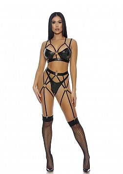 3pc. Lingerie set features matte faux leather embossed cheetah print bra with strappy design and gold hardware paired with matching panty and garter belt.