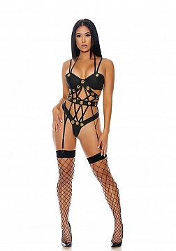 1pc. Teddy features strappy grommet detail with underwire cups and attached garter straps.