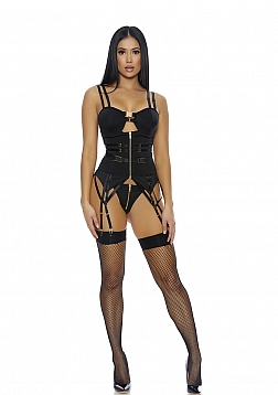 2pc. Lingerie set features tricot stretch dual velvet strap zipfront bustier with underwire cups and gold buckle hardware detail including attached garter straps paired with matching zipfront panty.