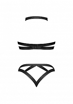 From the Lust collection this style includes: A strappy halter bra with ring accents and hook & eye closure at the neck and back, and a matching strappy cutout panty with ring accents. Distinctive leather look fabric featuring four way stretch and nickel plated studs