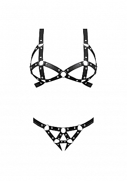 From the Lust collection this style includes: A strappy halter bra with ring accents and hook & eye closure at the neck and back, and a matching strappy cutout panty with ring accents. Distinctive leather look fabric featuring four way stretch and nickel plated studs