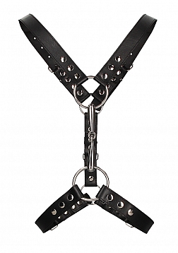 The harness that makes the perfect addition to any BDSM lover's collection. This heavy-duty harness serves fetish realness when worn over clothes, and lets your playmate know what they're in for in the bedroom. The perfect finishing touch to a bondage fuelled night in, or a party night out. Strap yourself into this studded harness to enhance what nature gave you. The harness features 2 metal O-rings that are perfect for attaching chains, leads and other BDSM accessories. Totally adjustable at the neck, waist and chest for a perfect fit, this harness moves seamlessly from everyday wear to private parties of the very naked variety. The chests strap is adjustable from 92 cm to 120 cm and the shoulder straps are adjustable from 54 cm to 75 cm.