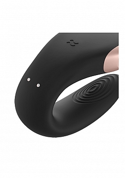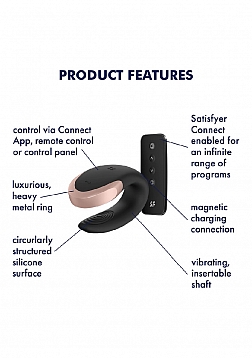 Double Love, our luxury couples vibrator, features thrilling soft silicone combined with high-quality precious metal. Doubly paired with a convenient wireless remote and our high-tech App, long distance play is possible and the options endless! Enjoy a breath of fresh air while making love with the Satisfyer Double Love! The couples vibrator with 2 motors will impress you with its classic U-shape, which stimulates both partners with powerful vibes. The slightly curved shaft is inserted vaginally and simultaneously stimulates the G-spot as well as the penis, while the upper part titillates the clitoris. The body-friendly silicone also seduces you with its smooth feel. The Satisfyer Double Love also has a lot to offer optically: The sophisticated details made of high-quality, real metal lend your lovemaking a touch of luxury. The Satisfyer Double Love can be controlled with the included wireless remote control as well as with the free Satisfyer Connect App. You can discover new facets of your love life together using the app: In addition to controlling your device remotely, you can also create your own vibration programs or have audio and video chats. What are you waiting for? The couples vibrator is waterproof (IPX7) so it can also enrich your love life in the shower or bathtub with its hot vibrations. If your couples vibrator ever runs out of steam, you can recharge the integrated batteries with the included USB charging cable.