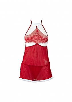 Baby, it will get hot inside in this darling babydoll and G-string set. The babydoll ties in the back, has an opening at the bust area and will make you feel lavish. The matching G-string is stretchy and is the same deep red shade as the babydoll. This set is comfortable for sizes S to XL. With this set you will surely have a sexy Christmas ahead of you. Handwash in cold to warm water, air dry. Do not iron.
