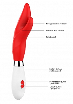 | Dimensions package | 10 x 4,90 x 27,50 cm | | Weight package | 164 gram | | Product dimensions | 22 x 4,5 x 6,5 cm | | Product weight | 117 gram | | Product diameter | 4,7 cm | | Insertable length | 13 cm | | Quantity motors | 1 | | Rotations per minute | 7000 RPM | | Speed modes | 10 | | Batteries required | 2 | | Batteries type | AAA | | Batteries included | No | | Splashproof | Yes | | Phthalate free | Yes | | Materials | Silky Smooth Silicone & ABS |