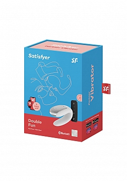 Product information "Double Fun" Our Double Fun powerfully stimulates both partners during sex. The U-shape is fitted both inside and outside - ensuring a seductive feeling for the clitoris, G-spot, and penis. App enabled, this high-tech toy is enhanced with remote play and more! What can the Satisfyer Double Fun couples vibrator do? The Satisfyer Double Fun will enrich your love life with powerful vibrations that stimulate both of you sensually. The classic U-shape couples vibrator is worn during lovemaking and stimulates the entire penis as well as the G-spot with its insertable shaft. The second motor is hidden at the other end of the couples vibrator and stimulates the clitoris at the same time. The couples vibrator is made of body-friendly silicone, which feels especially soft on the skin. Your fun together can also continue in the shower or bathtub: Thanks to its waterproof (IPX7) finish, the Satisfyer Double Fun is the ideal companion for wet and wild pleasure. If your device ever runs out of steam, you can recharge the integrated batteries with the included USB charging cable. Couples vibrator with remote control and app control It’s also intuitive to control: The various vibration programs can be controlled via the control panel on the couples vibrator itself, via the included wireless remote control or via the Satisfyer Connect App. You can discover even more upgrades for your lovemaking with app: You can create your own vibration programs, take control of your partner's Satisfyer or link your account to Spotify and more - there’s a lot to discover! The app is free and available for Android, iOS and Apple Watches.