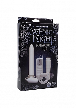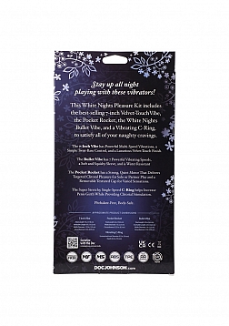 Stay up all night playing with these vibrators! This White Nights Pleasure Kit includes the best-selling 7-inch Velvet-Touch Vibe, the Original Pocket Rocket, the White Nights Bullet Vibe, and a Vibrating C-Ring, to satisfy all of your naughty cravings.