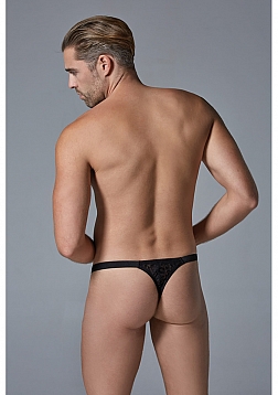 Leopard lace Jockstrap with skinny side straps. Elastic waistband, elasticized pouch and a leopard thong back.