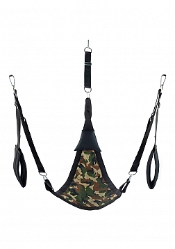 This Camo fabric sling is designed with a Triangle shape and Camouflage fabric. It fits with 3 or 4 attachment points. It comes with the accessories: the 4 hangers with the metal carabiners / the padded foot supports (11cm wide) / the black triangle cushion (24 x 20cm) Material: polyester made in Europe