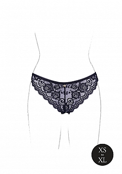 The beautiful lace design of these panties almost make you feel like a sweet maiden, until you turn around. The back of this bottom contains an open buttocks, but is also crotchless. A perfect mix of both sweet and salty.