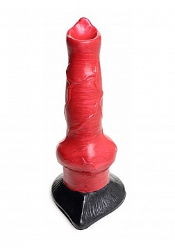 Pounce into playtime with this Hell-Hound Canine penis! The large, red dildo has bulbous testicle glands in a knot above the base, thick veins along the shaft, a concave head with pointed tip and a sturdy black base. Enjoy hands-free by using the strong, suction-cup base against a wall or flat surface or pair it with a strapon harness for pegging play! Use only with water based lubricant. Made of premium silicone, it is body safe and phthalate-free. The Hell-Hound is coming from you, and you can hear their snarling, wet growls and aching moans. Their teeth are at your throat as they pin you down to breed you, the long, red rocket dripping wet and penetrating your holes. Feel them push you into their long, thick phallus and stretch you, pulling you down to the hilt. See how deep you can get as they knot inside you! Whether you play the Hell-Hound and deliver each fierce stroke yourself, or you ride the dildo hands-free using the suction cup base, enjoy the fantasy delivered with this realistic, Hell-Hound Canine penis! After play is over, wash the dildo with warm water and soap and use a toy cleaner to spray clean. Wipe dry and store in a cool, dark place out of direct sunlight.
