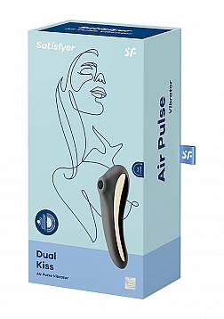 Get ready to kiss your old lover goodbye and say hello to the Dual Kiss! Offering both internal sensations and our award-winning Air-Pulse technology, the Satisfyer Dual Kiss is ideal for those seeking a 2-in-1 solution. With a slightly curved shaft, experience targeted g-spot arousal with your new Dual Kiss. On the other end of this versatile lover, find precise Air-Pulse pressure waves, sure to send you into pure bliss. The Dual Kiss comes equipped with two, independently controllable, motors with 10 vibration programs and 11 pressure wave intensities. Made of body safe silicone, the Dual Kiss is rechargeable. It is IPX7 Waterproof rated and ready for a deep dive! Experience new feats of pleasure with your all-new Dual Kiss.
