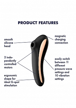 Get ready to kiss your old lover goodbye and say hello to the Dual Kiss! Offering both internal sensations and our award-winning Air-Pulse technology, the Satisfyer Dual Kiss is ideal for those seeking a 2-in-1 solution. With a slightly curved shaft, experience targeted g-spot arousal with your new Dual Kiss. On the other end of this versatile lover, find precise Air-Pulse pressure waves, sure to send you into pure bliss. The Dual Kiss comes equipped with two, independently controllable, motors with 10 vibration programs and 11 pressure wave intensities. Made of body safe silicone, the Dual Kiss is rechargeable. It is IPX7 Waterproof rated and ready for a deep dive! Experience new feats of pleasure with your all-new Dual Kiss.