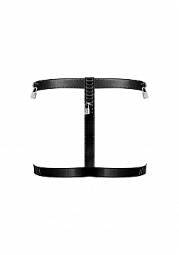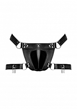 From the Leather collection by Male Power, this style includes: A chastity thong featuring an adjustable waist, leg and T-back straps secured with locks & keys, a soft stretch leather pouch and attached metal rings.