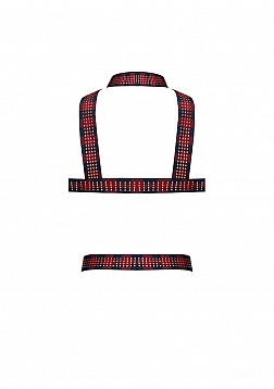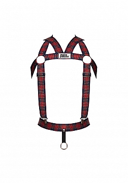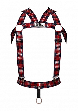 From the Elastic Harness collection by Male Power, this style includes: A harness featuring bands trimmed with metal studding, adjustable metal clips and a detachable waistband with a snap-off silicone rubber cock-ring.