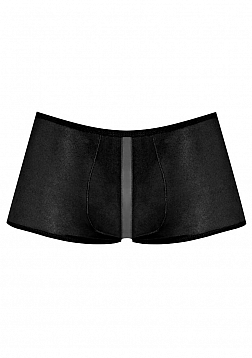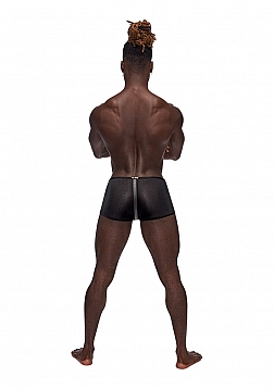 From the Landing Strip collection by Male Power, the Mini Short features thin plush elastic trim on waist and legs, a tone on tone matte onyx insert strip through pouch and rear, and a decorative metallic brand label on rear waistband.