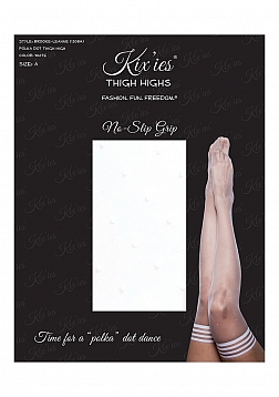 Flirty Flashback to the 1940s Polka Dot, but in a silky, sheer white! Perfect for any retro look or everyday wear! Pairs adorably with summer and spring outfits. Kix'ies thigh-highs are designed for all-day wear, with a no-slip-grip. We offer Petite to Plus Size Stockings and are the #1 thigh-highs that actually stay up!