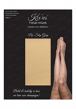 Kix'ies Champagne thigh-high tights. These thigh-highs are a day to night wardrobe essential, and the perfect way to kick it up a notch and make any outfit that much more chic! Kix'ies thigh highs are designed for all-day wear, with a no-slip-grip. We offer Petite to Plus Size Stockings and are the #1 thigh-highs that actually stay up!