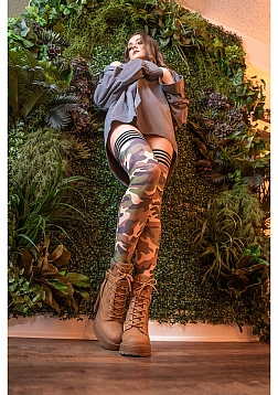Kix'ies camo print thigh highs! Our thigh-highs are designed for all-day wear, with a no-slip-grip. We offer Petite to Plus Size Stockings and are the #1 thigh-highs that actually stay up!