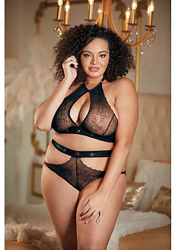 Top: Adjustable neck strap. Back neck hook opening. Center back hook and loop opening. Panty: Open back. Adjustable back straps. Center back hook and loop opening.