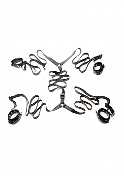 Measurements: Center strap adjusts up to 54 inches in length. Connector straps adjust up to 56 inches in length. Ankle cuffs adjusts from 8 to 12 inches in circumference. Wrist cuffs adjust from 6.5 to 10.5 inches in circumference.