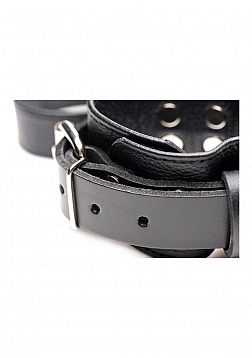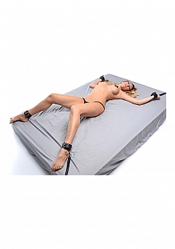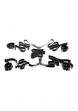 Better than your average bed restraint kit, this luxurious leather set with heavy-duty hardware captures the elegant atmosphere that you crave during your naughtiest private moments. Adjustable to fit any bed size, this system of bondage gear slides under your mattress, while each adjustable strap spreads out and emerges on the sides or head and foot of the bed, depending on how you like to play. Swivel hook clips connect to the D-rings of the sophisticated, leather wrist and ankle cuffs, allowing you to confine your lover in a variety of positions while you have your way with their helpless body!