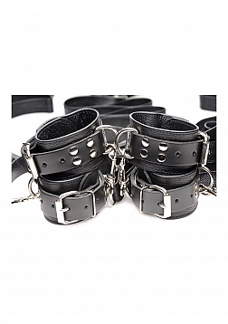 Measurements: Center strap adjusts up to 54 inches in length. Connector straps adjust up to 56 inches in length. Ankle cuffs adjusts from 8 to 12 inches in circumference. Wrist cuffs adjust from 6.5 to 10.5 inches in circumference.