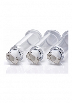 Suction provides exquisite sensation and enhanced sensitivity! Three small cylinders connect to a compatible pumping device to pinpoint pleasure on nipples, the clitoris, and other small areas. Create a strong seal, with the aid of a lubricant if necessary, and experience the tight pulling sensation as your delicate flesh is drawn into the cylinder and blood flow increases. The convenient clasps allow each accessory to be disconnected from your pump while still retaining the pressure within, allowing the use of all three cylinders at once. Release your tender parts for access to more hands-on play by pressing the small silver button on the top of each clasp. These small, durable pumping accessories are a stimulating way to amplify your solo or partner play!