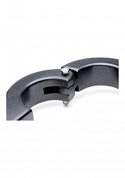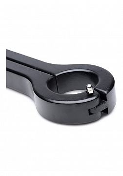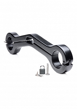 Keep your slave helpless to your every desire with a wicked device that binds those pesky wrists to those pathetic balls! This unique Humbler locks onto your playthings scrotum in front of their body, while keeping their hands out of your way so that you can do your worst! Curved to fit in the crook of their crotch with balls distended forward, this device will apply a vicious tug anytime they try to move their hands. They won't be able to shield themselves from your gaze, impact play, or any attention you might bestow upon their vulnerable cock! A hinge at one end makes it easy for you to open and close the Humbler, while the other end locks shut so that your slave has no hope for escape.