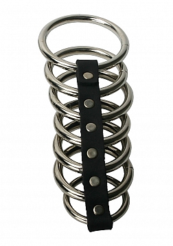 Put your penis in purgatory with the Gates of Hell Chastity device! This chastity devices is made up of a series of 7 nickel plated steel rings, attached together by a leather strap. The first ring is for your cock and the balls the rest of the rings are to secure the penis.