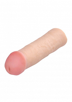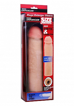 Slide into the Mega Penis Enlarger Sleeve and your size will be massively increased! This thick, stretchy, ultra realistic sleeve fits snugly around your shaft for extra staying power and an instant size boost, no creams, pills, or devices needed. The end is a solid extension that gives you another 2 inches in length! The Mega Enlarger Sleeve features thick walls of ultra realistic material that will add nearly another inch to your girth as well! This lifelike rubber is firm, yet squeezable, just like the real thing! For a custom fit, the bottom can be cut to size with a pair of scissors. Remains securely in place, with a hollow shaft that provides a snug fit. Guaranteed to add thickness and length and as easy to use as a condom, use the Mega Enlarger Sleeve today and enjoy your new longer, thicker, bigger rod!