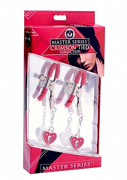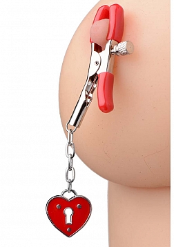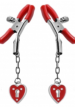 | EAN CODE: |  | 848518017062 |  These easy to use clamps have a simple screw-down design, accented with heart shaped padlock detailing. The vinyl coated tips allow for a comfortable and secure grip while the red lacquered heart accent dangles enticingly from the end. The screws on the sides allow you to control just how much pressure your partner receives.