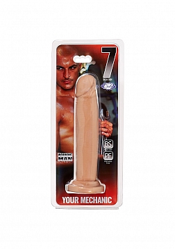 YOUR MECHANIC is a slim 7 inch dong featuring a realistic head, veined shaft and a suction cup base. Use alone or with a partner - the suction cup base can be used on any flat surface, or inserted in a harness. Odor-free, this dong is made with body safe, phthalate-free, non-toxic PVC. For use with water-based lubricants only.