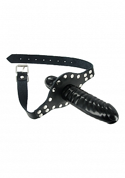 The Ride Me Mouth Gag keeps you stuffed and your partner silent! There is plenty of penetration to go around with a glossy black dildo on the outside, and a cock-shaped mouth gag on the inside. This double dose of dick is supported by a heavy-duty adjustable leather strap that buckles behind the head, and a studded mouth-guard. Fill up their mouth and then climb on and ride!