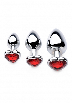 Ready for more anal pleasure? This set of three metal plugs is perfect for backdoor exploration! These beautiful butt plugs were designed to make anal play comfortable, exciting, and stimulating. Graduated in size, the plugs start out very small and increase at a comfortable interval. The tapered tip and smooth, seamless material create an easy insertion. The heart-shaped jewel at each base makes these buttplugs perfect for surprising your partner for a night in, but they are comfortable enough to wear long-term if you decide to go out first! Made of durable metal, these plugs are excellent for temperature play when you prepare them in hot or cold water. Compatible with both silicone and water-based lubricants. Clean with mild soap and warm water after use.